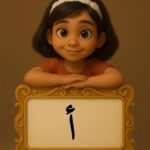 5 – صفحات التدريب على الكتابة: مجموعة من الصور بأسلوب بيكسار تمثل كلمات تحتوي الحرف المستهدف، وتُكتب الكلمة عدديد المرات بالحروف المنقّطة ليعيد الطفل كتابتها بيده، بهذا يجمع بين الصورة، والنطق، والكتابة، وهي الركائز الثلاث الأساسية لاكتساب اللغة.